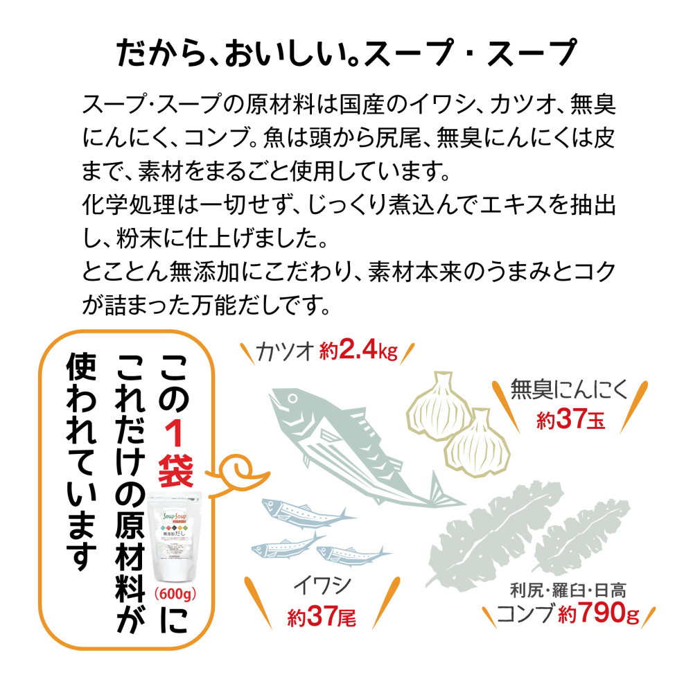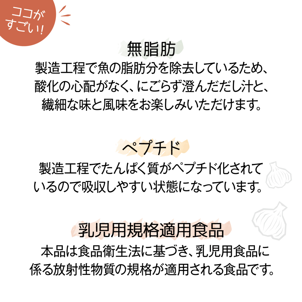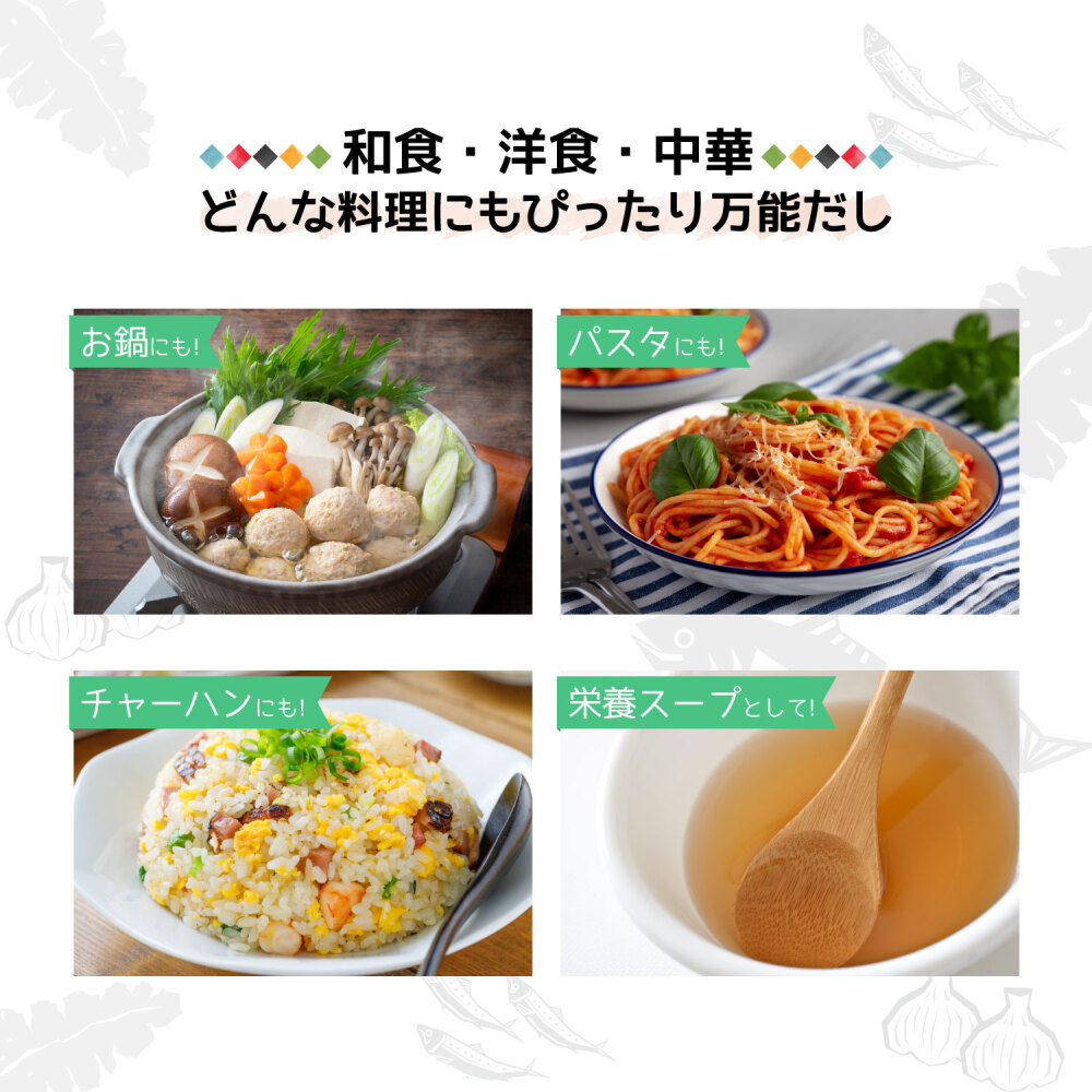 ●原材料・成分:でんぷん分解物(国内製造)、イワシ、カツオ、昆布、無臭にんにく、植物発酵エキスパウダー